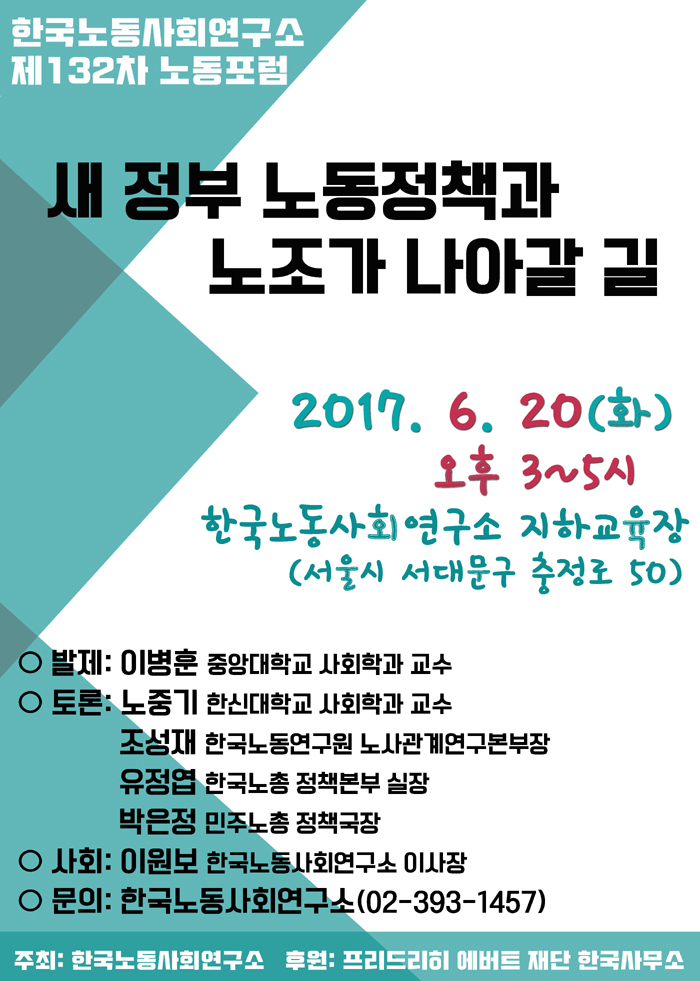 한국노동사회연구소는 오는 6월 20일(화) 오후3시에 제132차 노동포럼 '새 정부 노동정책과 노조가 나아갈 길'을 개최합니다.