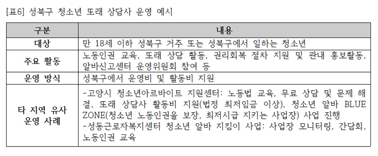 ❏ 알바신고센터에 청소년 또래 상담사 운영: 알바신고센터 운영자와 함께 상담과 피해 구제 활동을 펼칠 ‘청소년 또래 상담사’를 운영한다. 청소년 또래 상담사의 장점은 눈높이를 맞춘 상담과 해결 방법을 모색할 수 있다는 것과 청소년을 위한 정책 사업에 청소년이 주체가 된다는 점이다. 또래 상담사를 운영하는 고양시 청소년아르바이트 지원센터와 성동근로자복지센터 청소년 알바 지킴이 사업을 참고하면, 성북구의 또래 상담사 관련 모집 대상과 주요 활동을 다음과 같이 생각할 수 있다.