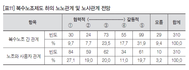 마지막으로 [표11]은 복수노조제도 하에서 노노관계 및 노사관계 전망을 정리한 것이다. 노노 간 관계가 갈등적일 것으로 전망하는 의견이 약 50%에 이르는 반면 협력적으로 전개될 것이라는 전망은 약 17%에 불과하였다. 반면, 노사 간 관계가 갈등적으로 전개될 것이라는 전망은 약 31%이고 협력적으로 전개될 것이라는 전망은 약 46%였다. 따라서 현재 사업장수준에서 복수노조 상태에 있는 노조들은 노사관계 갈등보다는 노노관계 갈등을 더 우려하고 있는 것으로 나타났다.