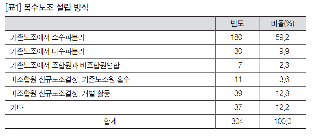 복수노조제도를 둘러싼 논의 과정에서 복수노조제도의 순기능적 기대효과로 주목되었던 것들 중에는 비조합원의 노조결성으로 인한 전체 조직률의 증대 그리고 결사의 자유 보장이 포함되어 있었다. 특히 후자의 경우 기존 노조의 분리를 일정하게 전제하고 있었다. 반면, 복수노조제도의 역기능으로 예상되었던 것은 기존 노조의 분리로 인한 노노갈등 및 노조운동의 약화였다. 복수노조 설립방식을 정리한 [표1]을 보면, 일단 비조합원의 노조결성 기회 확대 효과보다는 기존 노조의 분리 효과가 더 컸던 것으로 나타난다. 복수노조제도는 기존 노조 내 갈등이 조직 분리로 이어지도록 하는 기회를 제공한 셈이다. 그 비중을 과소평가할 위험이 있지만, 복수노조의 허용에 따라 조직률이 증대하는 경우는 상대적으로 적었던 것으로 보인다.