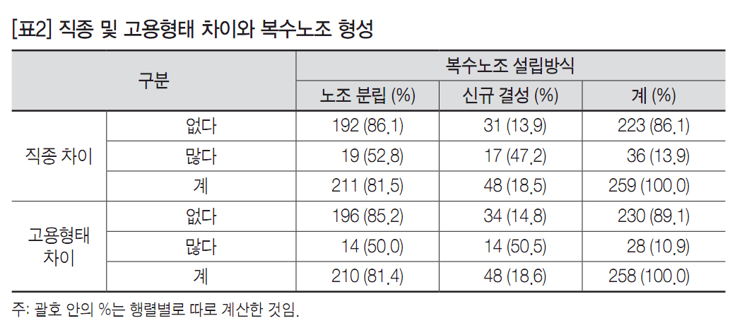 한편, 노조결성의 자유가 보장되는 경우 직종 및 고용형태별 이해관계의 차이에 따라 서로 다른 노조가 설립될 가능성이 높아질 것이라고 가정할 수 있다. 그것은 사업장 수준 직종 및 고용형태에서의 차이가 기존의 노조 분립이나 비조합원의 신규노조 결성으로 이어지는 형태로 나타날 것이다. 만약 사업장 수준에서 직종 및 고용형태에서의 차이가 없는데도 불구하고 기존노조가 분립되었다면 그것은 직종 및 고용형태 상 이해관계 차이 이외의 요인에서 비롯된 조직 내 갈등의 결과일 가능성이 크다. 직종 및 고용형태 차이별로 복수노조 설립 방식을 정리한 [표2]를 보면 이에 대한 단서를 찾을 수 있다. 일단 직종 및 고용형태에서의 차이가 없다는 응답의 비중이 차이가 많다는 응답의 비중보다 절대적으로 크지만, 직종 및 고용형태에서 차이가 많은 경우 그렇지 않은 경우보다 신규 노조 결성의 비중이 큰 것으로 나타난다. 직종 및 고용형태에서 차이 유무는 복수노조 형성이 노조 분립에 의한 것인가 아니면 신규 결성에 의한 것인가에 일정하게 영향을 미치고 있는 것이다. 따라서 복수노조제도는 직종 및 고용형태 등 노동시장 요인으로 인해 기존의 노조에 의해 보호되지 못하고 있던 노동자들이 신규 노조를 결성할 수 있도록 하는 제도적 장치로서 일정하게 효력을 발휘하고 있는 셈이다. 따라서 이상의 결과는 복수노조제도의 도입 이후 기존의 우려와 기대가 모두 현실로 나타났다는 것을 보여준다.