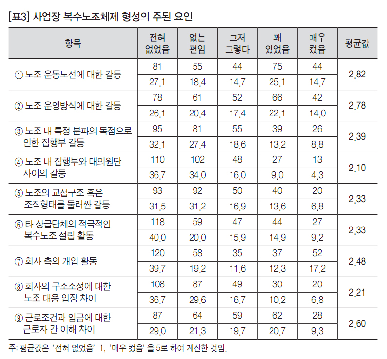 [표3]은 그동안 사업장 수준 복수노조 설립의 원인으로 지목되었던 사안들이 각 복수노조 사업장에 어느 정도 중요한 요인으로 작용했는지를 살펴본 것이다. 우선 [표3]은 △노조 운동노선을 둘러싼 갈등, △노조 운영방식을 둘러싼 갈등, △근로조건과 임금에 대한 이해관계의 차이 등이 다른 요인들보다 사업장 복수노조체제 형성에 상대적으로 더 중요하게 작용했다는 것을 보여준다. 반면 복수노조제도가 노노갈등을 낳을 것이라는 주장과 밀접하게 관련된다고 볼 수 있는 항목인 △상급단체들의 복수노조 설립활동 요인은 상대적으로 그 영향이 적었던 것으로 나타났다.