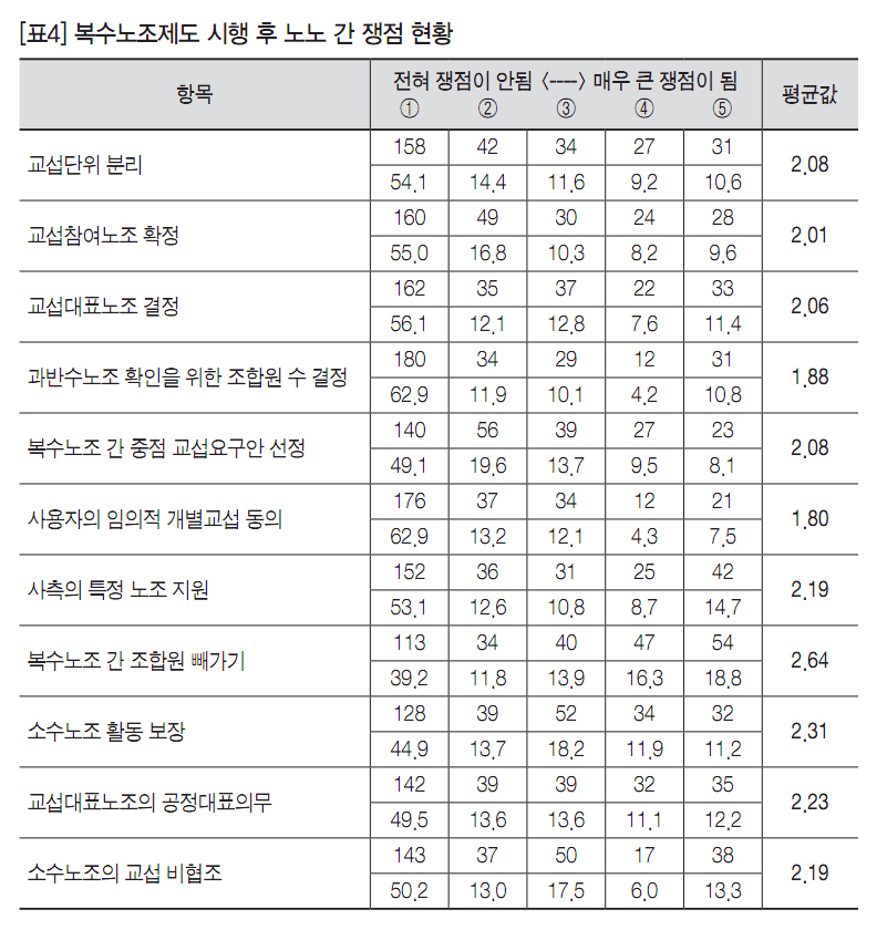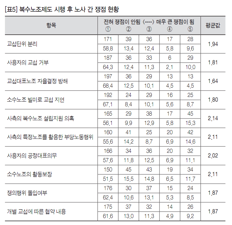 [표4]와 [표5]는 복수노조제도 하에서 노노 간 및 노사 간 쟁점 사안 관련 실태를 정리한 것이다. 먼저 노노 간 중요한 쟁점으로 부각된 사안은 △복수노조 간 조합원 빼가기, △소수노조의 활동보장, △교섭대표노조의 공정대표의무 등이었다. 이들 사안은 교섭창구단일화의 형식 및 절차에 관한 사안이라기보다 교섭창구단일화 전 과정에서 각 조직들의 권리 확보 문제와 관련된 것들이다. 특히 공정대표의무 준수 문제는 복수노조 간 중요한 쟁점이 되고 있는 사안이다.