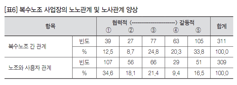 [표6]은 복수노조 사업장의 노노관계 및 노사관계의 협력·갈등 양상을 살펴본 것이다. 노조들 사이의 관계가 협력적이라는 응답은 약 21% 정도에 불과하였으며 갈등적이라는 응답은 약 54%였다. 사업장 수준 복수노조제도가 노노갈등을 초래할 것이라는 우려가 대체적으로 현실로 나타나고 있는 모습이다. 반면 노사관계 실태는 노노관계 실태와 반대의 양상을 보였다. 노사관계가 갈등적이라는 응답은 약 26%인데 비해 협력적이라는 응답은 약 53%였다.