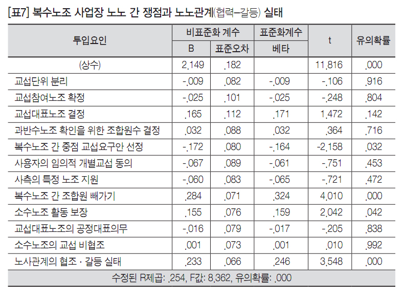 [표7]은 복수노조 사업장 노노 간 쟁점들 중에서 특별히 어떤 요인들이 노노관계의 협력 또는 갈등 상황과 강한 상관관계를 보이는지를 살펴보기 위해 간단한 회귀분석을 실시하여 정리한 것이다. 투입요인들 중에서 노노 간 관계의 협력-갈등 실태에 영향을 미치는 것으로는 △복수노조 간 조합원 빼가기, △복수노조 간 중점 교섭요구안 선정, △소수노조 활동보장 등의 요인이었다. 복수노조 간 조합원 빼가기와 소수노조 활동보장이 문제시되는 경우 노노 간 갈등 수준이 높은 것으로 나타났고, 복수노조 간 중점 교섭요구안 선정이 원만하게 이루어지는 경우에는 노노 간 협조 정도 수준이 높은 것으로 나타났다. 통제요인으로 노사 간 협력-갈등관계 요인을 함께 투입하였는데, 노사 간 협력 수준이 높을수록 노노 간 협력 수준이 높고 반대로 노사 간 갈등 수준이 높을수록 노노 간 갈등 수준이 높은 것으로 나타났다.
