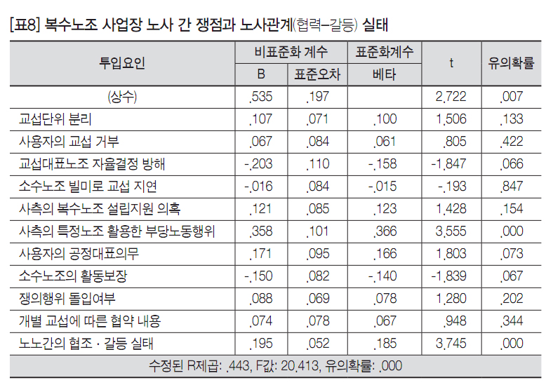 [표8]은 복수노조 사업장 노사 간 쟁점들 중에서 특별이 어떤 요인들이 노사관계의 협력 또는 갈등 상황과 강한 상관관계를 보이는지를 확인하기 위해 간략하게 회귀분석을 실시하여 정리한 것이다. 투입요인들 중에서 노사 간 관계의 협력-갈등 실태에 영향을 미치는 것은 특정노조를 활용한 사측의 부당노동행위 문제였다.