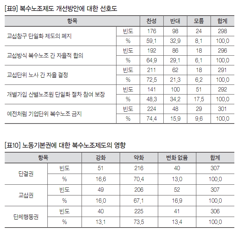 이 조사에서는 복수노조제도의 개선방안, 복수노조제도가 노동기본권에 미치는 영향, 향후 노사관계 전망 등을 함께 살펴보았다. [표9]는 복수노조제도 개선방안들로 그동안 제시되었던 의제들에 대한 선호도를 정리한 것이다. 먼저 교섭창구 단일화 제도의 폐지에 찬성하는 의견이 약 60%로 우세하였고, 교섭방식을 복수노조 간 자율적 합의로 결정하는 것에 찬성하는 의견이 약 65%로 우세하였으며, 교섭단위를 노사 간 자율적으로 결정하는 것에 대해서 찬성하는 의견이 약 75%로 우세하였다. 개별가입 산별노조원의 단일화 절차 참여 문제에 대해서는 찬성의견이 상대적으로 낮은 수준인 약 48%였다. 특히 사업장수준 복수노조제도를 폐지하자는 의견, 즉 예전처럼 기업단위 복수노조를 금지하자는 의견이 약 74%로 다수였다.