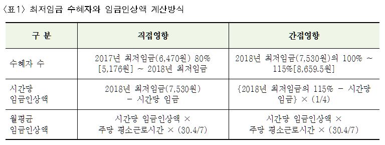 ○ 이 글에서는 경제활동인구조사 부가조사(2017년 8월) 자료를 사용하되, 미국 경제정책연구소(EPI)의 방법론을 참조해서, 2018년 최저임금 수혜자(영향률)와 임금인상액을 추정한다(<표1> 참조).