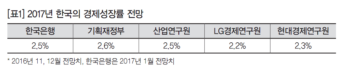 경제환경은 경기침체가 지속되고, 대내외 악재가 도사리고 있어 그 전망이 매우 불투명하다. 세계경제 둔화와 도널드 트럼프 미국 행정부의 출범으로 인한 보호무역주의 확산, 중국의 한반도 사드 배치에 대한 반발과 비관세장벽 강화는 물론, 미국의 단계적 금리인상 예고로 금융시장의 변동 폭이 커지고, 금리인상이 1,300조 원이 넘는 국내 가계부채에 영향을 줄 경우 우리 경제에 뇌관이 될 수 있다. 또한 조선‧해운업 구조조정이 2단계로 접어든 상황에서 제조업의 재고증가‧가동률 하락으로 인력구조조정이 예견되고 있어, 올해 국내 경제성장률이 2%초반(경우에 따라 1%진입 가능성)으로 제시되는 등 저성장이 이어질 전망이다.