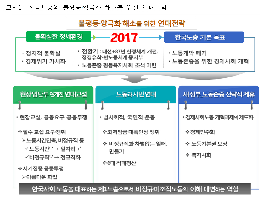 한국노총의 2017년 운동방향은 정치적, 경제적으로 불확실하고 변동 가능성이 높으며 불안정한 정세 하에서 한국사회 노동을 대표하는 제1내셔널센터로서, 비정규직‧미조직노동의 이해를 대변하고 이를 중심으로 조직노동의 역할을 제고하는 것이다. 한국노총은 이를 위해 불안정, 양극화 해소를 목표로 3가지 연대전략을 추진하고자 한다. 첫째, 현장 임단투와 연계한 연대교섭이다. 단위노조 임단투에 있어 노동시간 단축과 비정규직 의제를 필수교섭 요구로 제기하고, 이를 쟁취하는 현장 연대교섭을 전개할 계획이다. 둘째, 노동과 시민 연대를 통해 범사회적으로 ‘노동개악 등 6대 적폐 청산’, ‘비정규직과 차별 없는 일터 만들기’, ‘최저임금 대폭인상(1만원)’ 등을 추진한다. 셋째, 노동과 새 정치권력 간 전략적 제휴를 통해서 경제민주화, 복지사회, 노동기본권 보장 등 ‘경제사회 노동개혁과제의 정책 및 제도개선’을 추진‧쟁취할 방침이다.