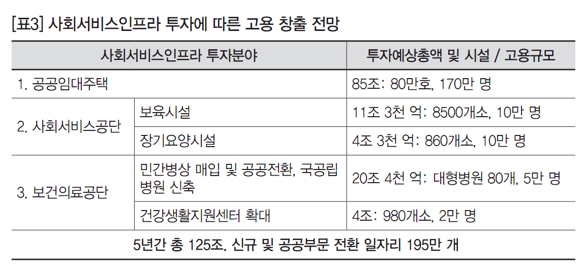 저출산과 고령화 문제는 경제‧사회는 물론 공적연금의 지속가능성까지 저해한다. 현재 국민연금 기금의 주된 투자가 금융상품에 집중되어 금융시장 변동 시 막대한 기금손실이 우려되는 상황이다. 따라서 저출산‧고령화 문제에 대한 적극적인 대응과 사회공공성 강화를 통한 복지국가 건설, 양질의 일자리 창출을 위해서는 연기금의 공공투자 확대를 대선 정책의제로 정하고 새 정부 국정과제로 추진하도록 참여전략을 강화해야 한다. 국민연금 547조 원의 연기금 중 5년간 125조 원(연간 25조 원)을 공공사회서비스 인프라에 투자하여 보육, 요양, 보건의료, 임대주택 등 공공분야에 투자하게 되면 ①공공임대주택, ②국공립 보육 및 장기요양 기관을 총괄하는 사회서비스공단, ③국공립 병의원 및 건강생활지원센터를 총괄하는 공공보건의료공단을 설립하고, 총 200만개의 신규 및 정규직으로 전환 가능한 일자리를 만들 수 있다.