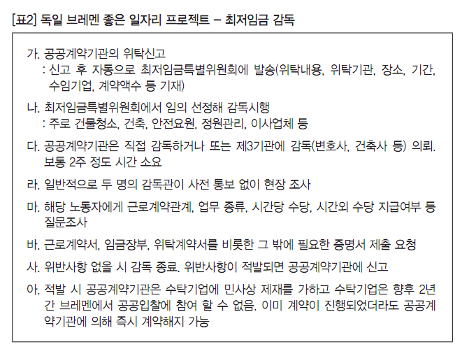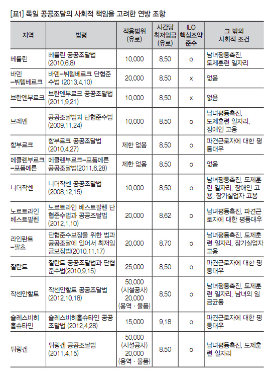 독일 지방정부는 공공부문 조달 정책을 통해 사회적 책무를 다하고 있는데, 고용뿐만 아니라 평등 지향적 고용과 차별 문제에도 개입하고 있다. 또한 몇 년 전부터 브레멘은 공공부문 ‘좋은 일자리 프로젝트’의 일환으로 강력한 최저임금 준수 사업을 진행하고 있다. 뮌헨이나 함부르크는 취약계층을 위한 다양한 일자리 프로그램을 통해 노동시장에서의 공정한 기회제공을 모색하고 있다. 이주노동자나 취약노동자층은 지역노동시장에서 사회적 배제를 당하는 경우가 많기 때문에 이런 문제를 해소하기 위해서는 중앙정부뿐만 아니라 지방정부의 역할이 매우 중요하다.