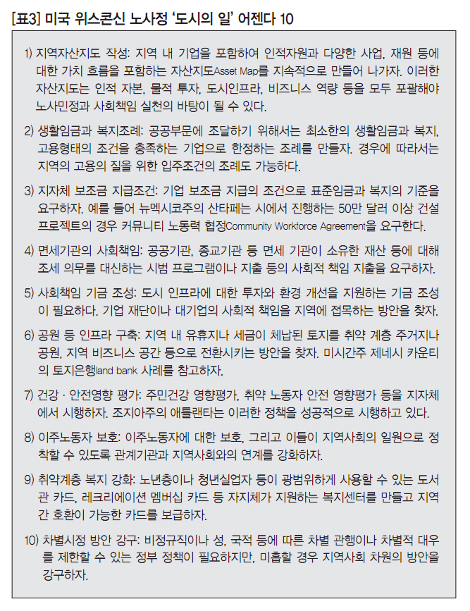 미국 위스콘신 모델처럼 노사정이 협력하여 지역경제와 일자리 문제를 함께 해결해 나가는 좋은 사례도 있다. 그러나 위스콘신 모델 그 자체보다 ‘도시의 일’이라는 어젠다에서 우리는 더 많은 시사점을 찾을 수 있다. ‘도시의 일’이 제시하는 주요 과제는 생활임금과 표준임금, 사회책임 기금 조성, 건강과 안전, 차별시정 그리고 이주노동자 문제와 취약계층의 복지 강화 등으로, 이는 서울이나 주요 대도시에서 노동정책을 수립하면서 한번쯤 검토하면 좋을 의제로 보인다.