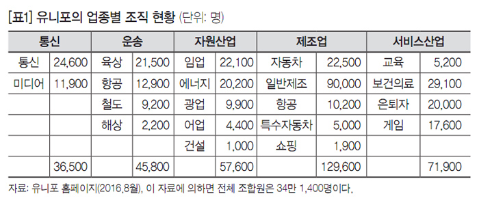 특이한 것은 유니포의 역사를 보면 캐나다 자동차 노조(CAW)로 불리던 시절에도 자동차 공장에서 일하는 조합원은 전체 조합원의 30%에 불과했고 서비스 및 일반노조 조합원이 더 많았다는 점이다. 통합 이후 현재는 통신, 운송, 자원사업, 제조업, 서비스 산업 등 다양한 산업과 퇴직 조합원을 포괄하고 있는데 단일 직종으로 가장 규모가 큰 부문은 보건의료부문(2만 9천 명)이다. 그러나 여전히 자동차 부문의 조합원들이 지도력을 행사하고, 재정에도 많은 기여를 하고 있다.