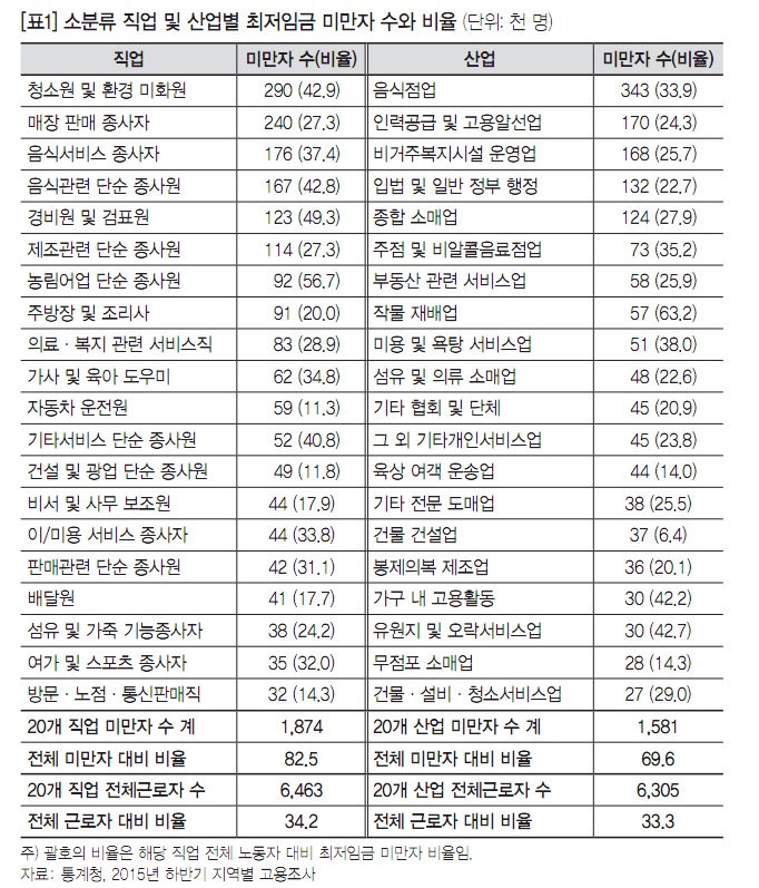 우리나라에서 최저임금에도 미치지 못하는 저임금을 받는 노동자들의 비중이 매우 높다는 점은 잘 알려져 있다. 통계청의 지역별 고용조사(2015년 하반기) 기준으로 최저임금 미만의 임금을 받는 것으로 조사된 노동자(이하 ‘최저임금 미만자’)는 227만 2천 명으로 이 조사에 따른 임금노동자 1,982만 1천 명 가운데 12.0%에 이른다. 이는 경제활동인구조사를 기준으로 한 최저임금 미만자의 비율과 큰 차이가 없다. 이렇게 최저임금 미만자가 많은 것으로 조사되는 이유는 경제활동인구조사나 이 조사가 가구조사여서 임금정보가 정확하지 않기 때문이라는 지적도 있다. 그러나 사업체를 대상으로 조사하는 고용노동부의 고용형태별 근로실태조사(2015년 6월)를 이용하더라도 최저임금 미만자 비율은 11.2%(2015년 6월 기준)로 나타난다.