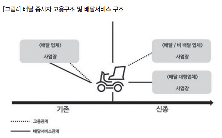 기존 배달업 고용구조는 배달서비스 제공사업주와 배달원의 고용주가 일치했다. 하지만 신종 배달업에서는 고용구조와 서비스 제공 관계가 불일치하여, 특수고용형태와 같은 삼각관계를 형성한다([그림4]). 예를 들면 A떡볶이가게 배달원의 고용관계는 생산(떡볶이)과 소비(고객주문)가 발생하는 A떡볶이 사업주가 아니라, A떡볶이 배달대행업체(사용사업주)와 성립되는 것이다.