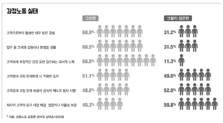 이러한 상황임에도 불구하고 금융산업 현장에서 감정노동 문제 해결을 위한 제도화는 더딘 편이다. 지난 2016년 국회에서 금융산업 관련 6개 법률에 고객응대 종사자의 보호 조치가 법률에 통과되었음에도 현실에는 평가와 모니터링 등에 의해 작동되지 않고 있다는 의견이 많다. 첫째, 금융산업 노동자들은 지난 6개월 사이 직장 업무를 수행하면서 고객의 무리한 요구를 수용한 경험이 절반(51.7%)이나 되었고, 수용한 이유는 고객의 협박위협(35.4%) 때문으로 이로 인해 근무의욕 저하(38.1%)나 업무지연과 방해(30.6%)라고 인식하고 있었다. 둘째, 금융산업 노동자들은 일상화된 금융권의 CS 평가가 고객서비스에 도움이 안 되는 것으로 인식(100점 만점 중 28.2점)하고 있었고, 실적평가에도 도움이 안 되는 것으로 인식(100점 만점 중 24점)하고 있어, 제도개선 필요성(폐지 31.3%, 인사평가 반영 규제 19.5%)을 갖고 있다.