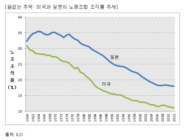 태평양을 두고 서로 마주보고 있는 일본과 미국은 이제 노동조합에게 어려운 공통의 질문을 던지고 있다. 과거처럼 노조 활동의 어려움을 마냥 외부 정치환경에만 돌릴 수 없다. 노동자가 왜 노조를 멀리 하려는지, 또 노조는 왜 노동자의 생활 향상과 사회적 진보에 적극적으로 기여할 수 없게 된 것인지를 근본적으로 묻고 있다. 경제만 위기가 아니다. 노조도 위기다.